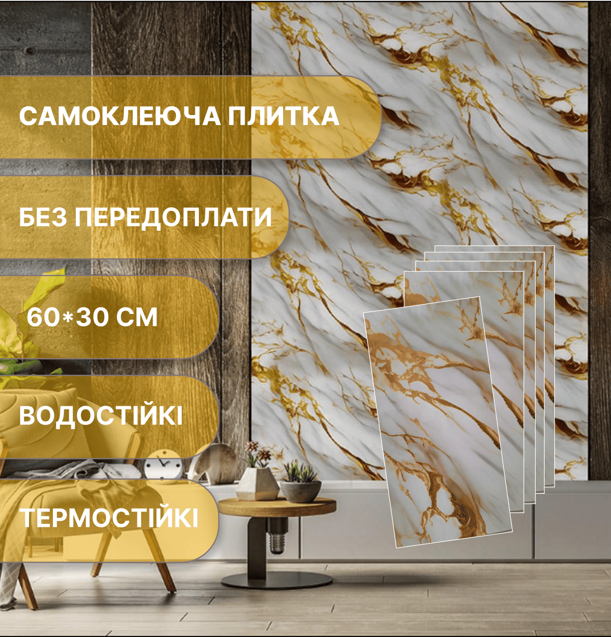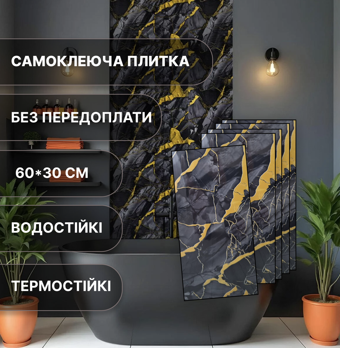 Плитку легко встановити самостійно, без необхідності наймати професіоналів. Просто видаліть захисний шар і притисніть плитку до поверхні. Вона ідеально підходить для кімнат з вологістю завдяки своїм водовідштовхувальним властивостям.